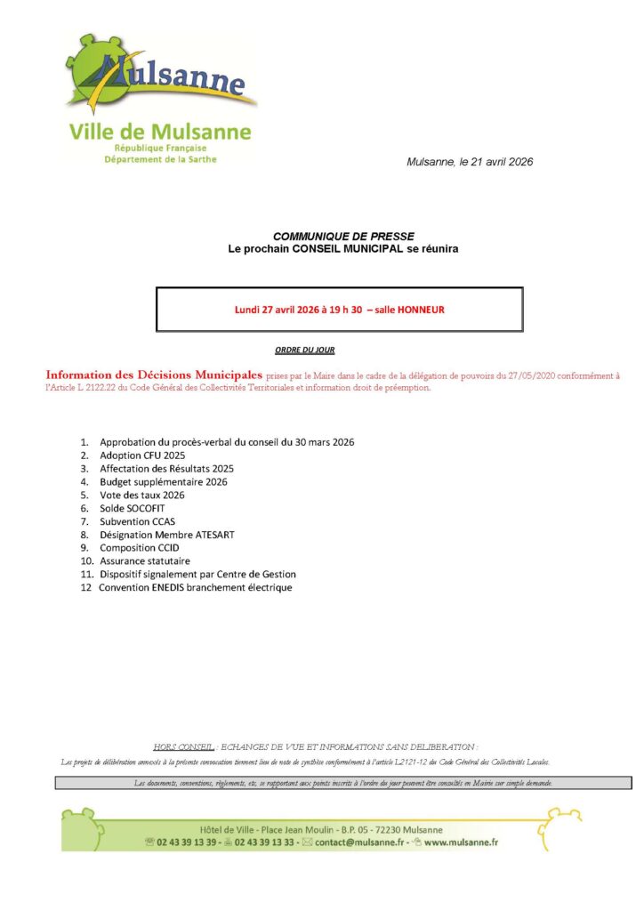 Le prochain conseil municipal se tiendra à la salle d’honneur de la mairie. La séance est publique.